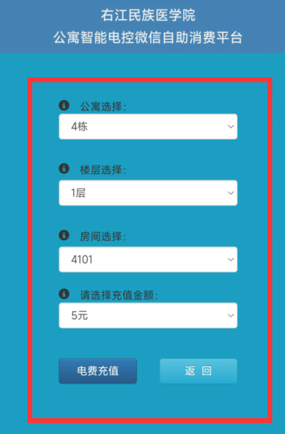 3.进入缴费界面选择需要充值的宿舍号、充值金额,然后点击电费充值。